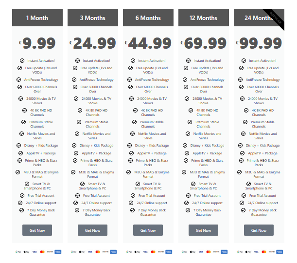 OSIRIS IPTV has flexible pricing options for short or long-term subscribers. Although rates vary by provider and reseller, plans commonly include: